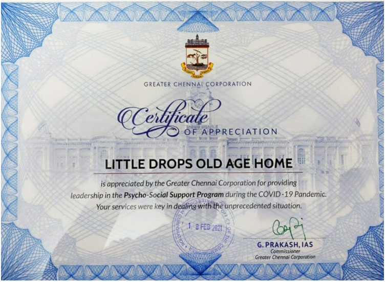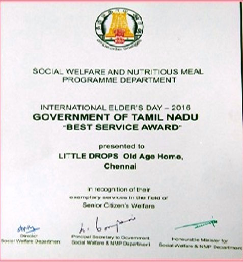 "BEST SERVICE AWARD" FROM GOVERNMENT OF TAMILNADU ON INTERNATIONAL ELDER’S DAY IN THE YEAR 2016