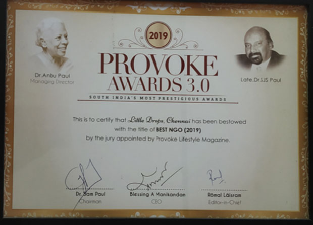"BEST NGO AWARD" FROM PROVOKE AWARD 3.0 IN THE YEAR 2019 BY THE JURY APPOINTED BY PROVOKE LIFESTYLE MAGAZINE